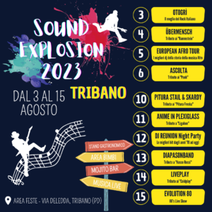 A grande richiesta ecco il volantino ufficiale della 7° edizione di SOUND EXPLOSION 2023, dal 3 al 15 Agosto in Area Feste a Tribano.